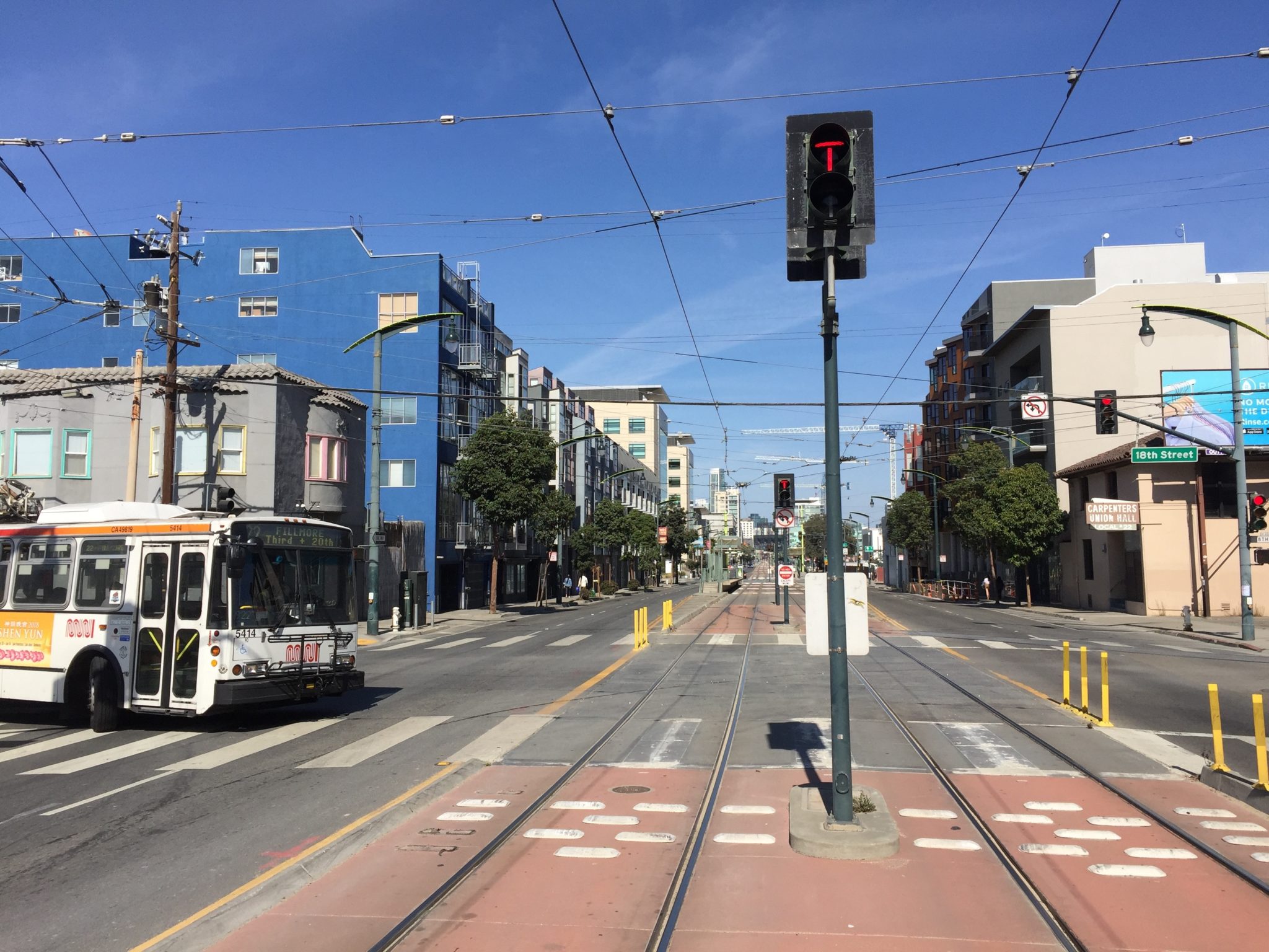 Fast forward to today. The 22-Fillmore STILL turns this corner, beginning its terminal loop (though it has been a trolley bus line for almost 70 years). The streetcar tracks on Third that disappeared in 1941 are back, carrying Muni’s T-Third line for the past ten years. There’s a track switch in the intersection again as well, but this time, it’s for the short-turn streetcar loop that was started during T-line construction and is only now being completed. The saloon is gone, replaced by a popular Dogpatch restaurant, Moshi Moshi. Can’t be sure, but it’s probably the same building, much altered. That building, though, will soon give way to new housing in this rapidly changing neighborhood, as will the venerable Carpenter’s Union hall on the right side of the photo. And the new Warriors arena, Chase Center, is now rising where the north end of that streetcar viaduct used to be.