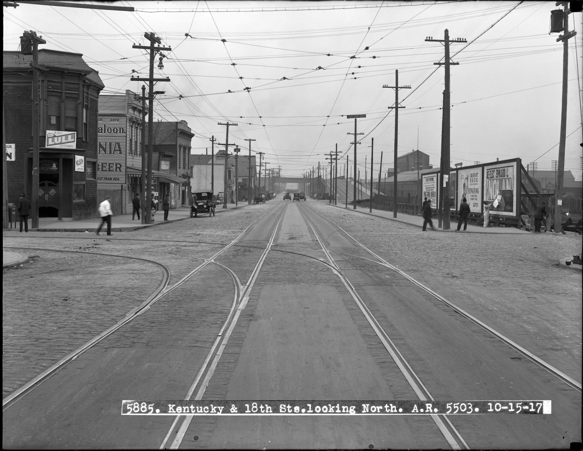 The tracks turning to the left belong to the 22-Fillmore streetcar line, which turned onto Kentucky and terminated in the carbarn on Third near 23rd Street. A municipal election is near, hence the campaign posters, including the one to “Re-elect George Lull City Attorney” over the saloon door to the left. A lone Model-T sits at the curb by the saloon, and a horse-drawn wagon lingers at the corner of Mariposa.