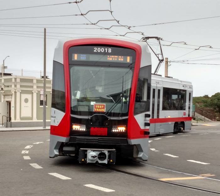 In the morning (above), he trained operators on Muni’s newest model of LRV, Siemens car 2001, delivered earlier this year. (The first Siemens cars are due to start carrying paying passengers next month.) Above. 2001at the N-Judah Ocean Beach terminal.