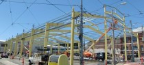 They raised the first steel posts and roof beams yesterday for the new Geneva Canopy. This is the culmination of more than a dozen years of advocacy by Market Street Railway to give the irreplaceable historic streetcar fleet protection from the elements when the vintage streetcars are not on the streets. (We have a major article on this in the new issue of our newsletter, Inside Track, which will be mailed to our members next week.)