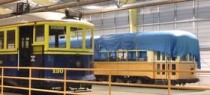 The long-awaited shed at Geneva Division is covering its first streetcars tonight. Vulnerable canvas-roofed streetcars including 1914 Muni No. 130 and 1926 Johnstown, PA No. 351 (left) were joined by venerable 1916 work car No. C-1 in taking shelter under the new canopy structure, after the 600 volt overhead wires were activated today. Regular F-line revenue streetcars, including PCCs, Milan trams, and older vintage cars, are pulling into the shed tonight.Market Street Railway is working with Muni to schedule a formal dedication of the facility, which our organization has advocated for more than a dozen years, helping Muni arrange funding from the San Francisco Municipal Railway Improvement Corporation (SFMRIC), among other sources.What a warm sight on a rainy night! Congratulations to all at Muni who have supported this effort.