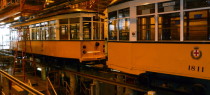 Lucky in craps, lucky in streetcars. The two yellow Milan trams (1807 and 1811) luckily showed up back to back on the service pits at Geneva Division the other night as a camera wandered past. It’s a tribute to Carole Gilbert and her Muni paint crew that 1811, painted some time ago, looks as fresh as the freshly painted 1807, which just reentered service following two years of accident repairs.