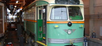 When Muni created its F-line PCC streetcar fleet in the early 1990s, they decided to paint the streamliner streetcars in the liveries (paint schemes) of some of the 30 North American cities that once operated this great streetcar design. Storage limitations at the time restricted the “palette” of colors they could use to eight. That meant choices had to be made. Everyone wanted a streetcar to pay homage to Chicago, because the Windy City had one of the largest PCC fleets ever. But the best-remembered paint scheme used by the Chicago Transit Authority, nicknamed the “Green Hornet” livery, required an unusual shade called Mercury Green. So it was decided to use the later darker green scheme, which was pretty close to Muni’s old livery and was not distinctive.But five years ago, No. 1058 went out of service after a bad accident, when a trolley bus swerved directly in front of it. With short-staffed maintenance crews, it has taken a long time to get the extensive body repairs done. Since it needed an entire new paint job anyway, the paint shop, led by Carole Gilbert, agreed to add the Mercury Green color to their palette (which has expanded significantly). The exact shade was determined through a check with the Illinois Railway Museum, which has an original Chicago PCC in that livery. The trim colors, which come from Muni’s existing palette, are very close matches to the original Chicago colors of “Croydon Cream” and “Swamp Holly Orange.” The Muni painters who did this great job are Willie Alexander, Leon Bernal, Arthur Leary, and Carlos Montes. Thanks to all of them!No. 1058 is still a few months from returning to the streets, with electrical work still to be repaired in the operator’s cab, but we got a sneak peak recently during our streetcar decorating party at the Geneva Yard and share it here. (The car number, which will be in the original Chicago Railroad Roman font, and the orange CTA logo, are on hand and will be applied when No. 1058 is ready to return to service.)
