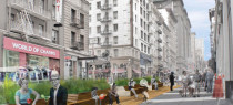 Our friends at Streetsblog San Francisco offer some solid coverage of an offer Audi has made to the city: install two blocks of pedestrian amenities, including widened sidewalks and seating areas, on Powell Street between Ellis and Geary. We won’t duplicate what they wrote, but will note that beyond the pedestrian benefits, which could be considerable, this should make cable car operation in that area safer and more reliable.With parked automobiles and trucks in the curb lane, running board riders take the risk of getting whacked by vehicle mirrors if they let it all hang out just a little too far. And motor vehicles pulling in and out of the parking spaces can cause significant delays.We’re assured that the design shown above is only conceptual; final decisions will be made locally. We hope so. The concept of the Otis Spunkmeyer lookalike drinking some kind of green Caribbean cocktail on Powell is a tad jarring. To add to the somewhat surreal scene, there’s no cable car in sight, but riding the tracks we can clearly discern — a vintage VW Microbus! Did Ken Kesey design this?Seriously, if they actually intend to install benches like the ones “conceptually” shown, the people who actually occupy them probably won’t look like the folks in the drawing. Will the result be inviting to pedestrians, or will it turn into a gauntlet like you often find in the cable car passenger queue at Powell and Market?Just asking.With the right installation, though, this could be a huge plus for lower Powell Street, giving pedestrians much needed additional room to walk and clearing the way for at least a modest improvement in cable car service.Best of all, if this temporary installation works, it can help pave the way for something permanent, perhaps modeled on the existing one-block cable car plaza between Market and Ellis.The promenade is scheduled to be installed by April 2011. It is being managed by the Union Square Business Improvement District.
