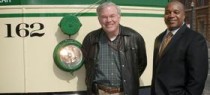 Cam Beach with Muni Executive Director Nat Ford and Cam’s favorite vintage streetcar, 1914 car No. 162, part of Muni’s original fleet. SFMTA photo.