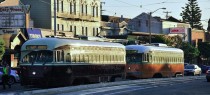 In the gloaming on West Portal Avenue, PCCs honoring Toronto (1074) and Los Angeles (1080) are about to turn onto the L-Taraval line for testing and training, December 8, 2011. Photo copyright Jeremy Whiteman.