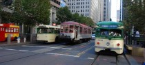 226 years of Muni history at Market and Spear Streets, all carrying delighted passengers today. Left to right, 1950 trolley coach No. 776, 1912 streetcar No. 1, and 1948 streetcar No. 1006, all Muni vehicles restored to their original condition. They’ll be part of the fleet out next Sunday as well to celebrate Muni’s centennial. So will 1906 cable car No. 42, just out of frame to the right of this shot. That made it 341 years of San Francisco transit history at one corner today. Rick Laubscher photo. Click to enlarge