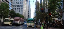 Scenes such as this will be common this weekend. Taken during Muni’s centennial celebration last weekend, this lineup at Market and California Streets shows (left to right) trolley coach No. 776 (1950), Muni’s Car No. 1 (1912), PCC No. 1006 (1948), and behind the trees to the right, O’Farrell, Jones & Hyde Streets cable car No. 42 (1906). Rick Laubscher photo