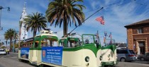San Francisco’s two "boat trams," originally from Blackpool, England, pose together for the first time on The Embarcadero during Muni Heritage Weekend. The new acquisition by Market Street Railway, No. 233, made possible by a generous grant from the Thoresen Foundation and a shipping subsidy from FedEx Trade Networks, is to the left, with No. 228 to the right.