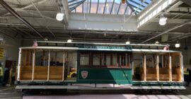 As we’ve mentioned, the civic celebration of 150 Years of Cable Cars kicks off at 11 a.m., Tuesday, June 13 at California and Market Streets as Mayor London Breed is joined by Board of Supervisors President Aaron Peskin, Cable Car Inventor “Andrew Hallidie” (or a reasonable facsimile) and the oldest and largest cable car in the fleet, Sacramento-Clay Car “Big 19”, which will carry the dignitaries up through Chinatown and over Nob Hill to Polk Gulch and Van Ness Avenue, parallel to Hallidie’s original Clay Street line two blocks north. Here’s “Big 19” taking a spin on the cable car barn turntable, getting ready for its closeup.