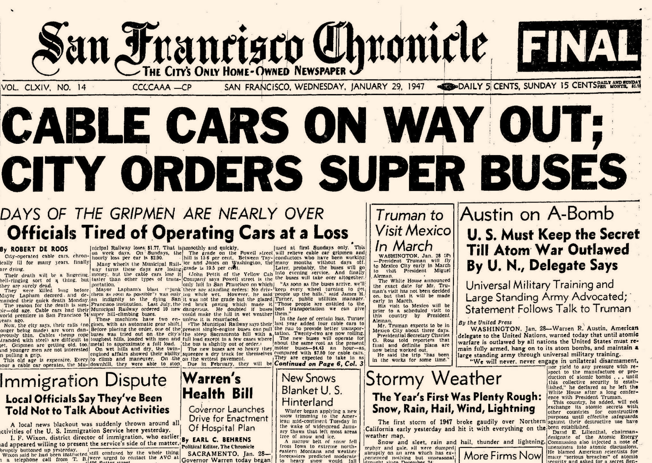 Not everyone cheered. Notably, the San Francisco Chronicle, which had displayed a notable anti-cable car bias in its news stories throughout the campaign, reported on the election victory thus: “It was a victory of sentiment over cost sheets and the opinions of transportation engineers.” (In a 2021 article entitled “A shame revealed: that time the Chronicle tried to kill the cable cars,” the paper’s culture critic, Peter Hartlaub, recounted and denounced his newspaper’s 1947 coverage, describing it as “pure weaseliness…a sort of Grand Moff Tarkin to Lapham’s Darth Vader.”)