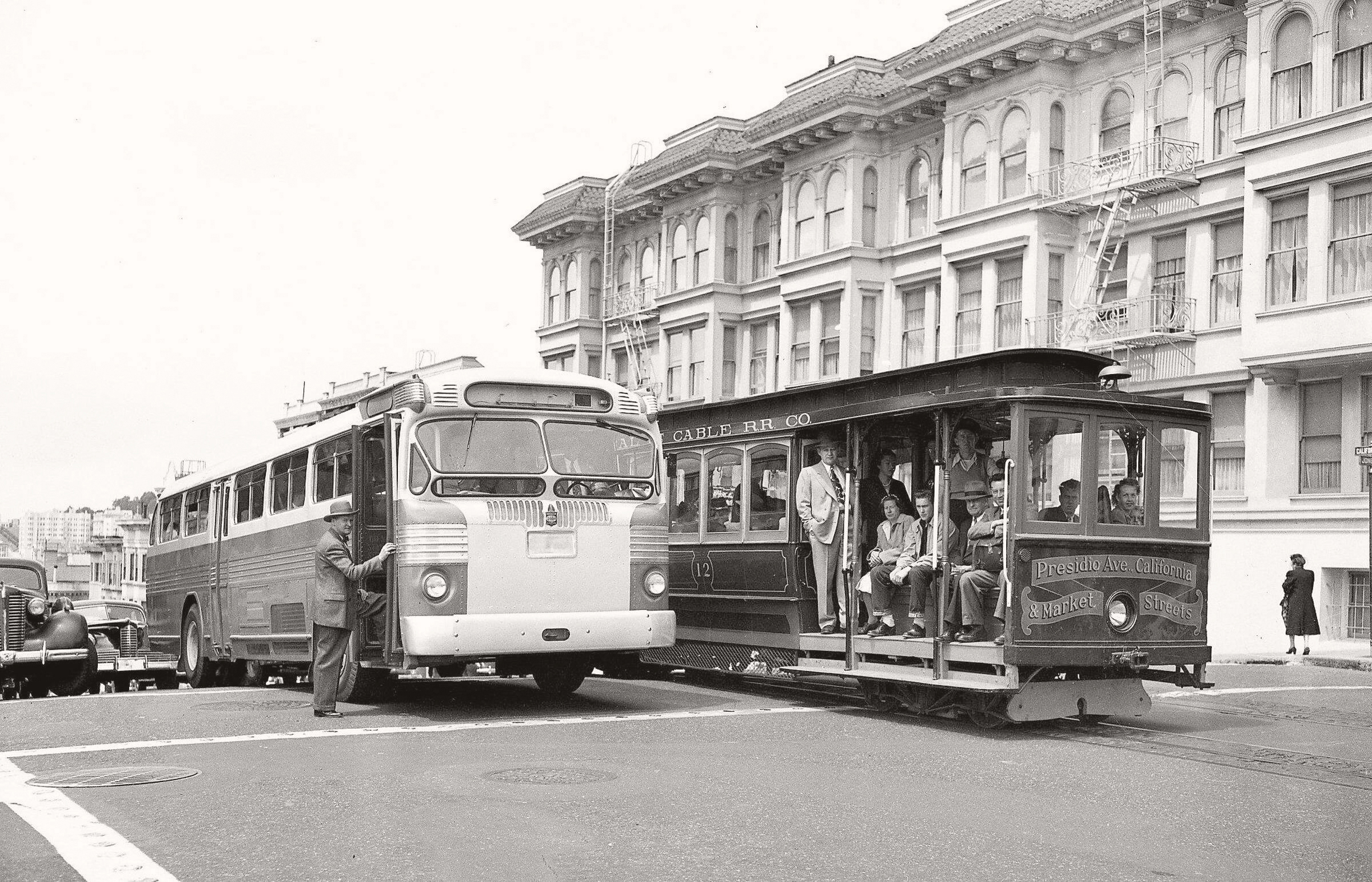 To the private companies that owned them, cable operations had become money pits, with their small capacity, a required two-person crew, and a complicated and cranky underground propulsion system that they did the minimum to maintain. The cable cars had many local fans, to be sure, regular riders who used them for actual daily transportation. But when lines were threatened with shutdown in the early 1940s, there were few to-the-barricades defenders. Our namesake Market Street Railway Company (MSRy) was able to kill off two cable lines—Castro Hill and Sacramento-Clay—plus the Fillmore Hill cable-assisted counterbalance line, in 1941-42.