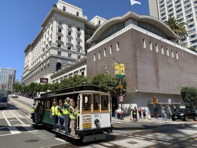 Sacramento-Clay cable car 19 passes the Fairmont Hotel on California Street (one block south of its old route) during tests in August 2019.