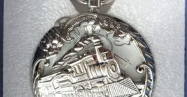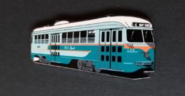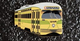 This exquisite lapel pin represents one of San Francisco’s fleet of tribute PCCs, this one honoring Cincinnati where they ran in service from 1939-1951. Pin measures 1.25″ across and attaches with post & rubber clasp. Larry Hodson design. Read More……