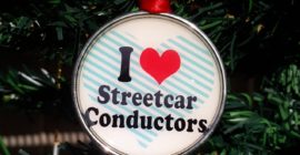 Add a little San Francisco to your holiday decorations and support Market Street Railway’s efforts to bring back the F-line! From the Kurt Adler collection, this hand-crafted glass ornament, is 3″ diameter and comes in a clear plastic box. All proceeds go toward our efforts to return the vintage fleet to regular service on Market Street. Read More……