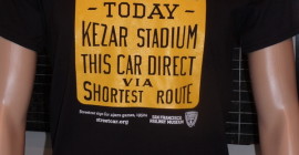 San Francisco Municipal Railway Kezar Stadium dash sign t-shirt in black, teal or tan, promoting Muni’s “shortest route” service via the N-Judah for 49er and college football games in the 1940s and 1950s. Read More……
