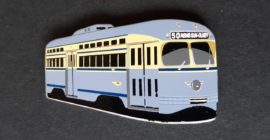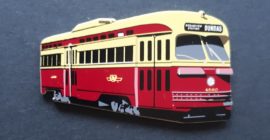 This image honors Philadelphia PCCs that ran in service from 1938-1947. Pin measures 1.25″ across and attaches with post & rubber clasp. Larry Hodson design. Read More……
