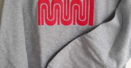 This hoodie displays the current logo of the San Francisco Municipal Railway (“Muni”). This logo, known colloquially as the “worm” because of the twists that spell out “Muni”, was created by famed San Francisco industrial designer Walter Landor. Popular with Muni operators and rail fans alike, this soft, durable cotton blend hoodie comes in grey with red Muni logo.