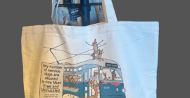 Celebrate our vintage streetcars with the California Cable Car full-size gusseted grocery tote. Canvas tote measures 14″h x 13″ x 7″ and is 100% cotton. Premium quality construction with a 6″ x 8″ image of the iconic view of the California Cable Car line. Durable fabric and machine washable. Read More……