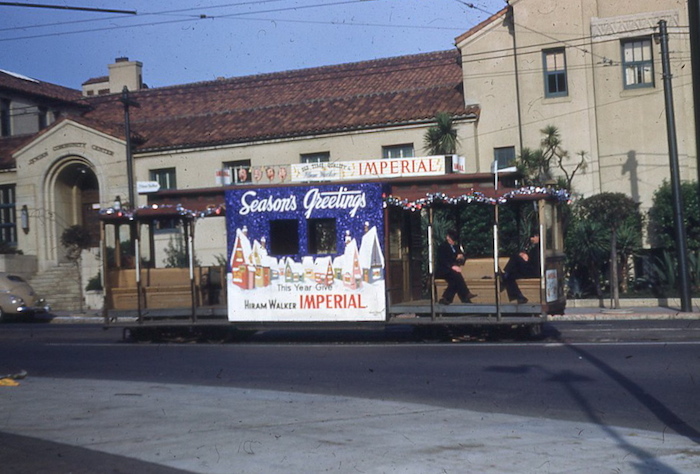The shot above dates to the last holiday season of operation for Cal Cable. It has to be 1950, since the trolley bus wires are in place for the impending conversion of Muni’s 1-California to trolley coaches. Cal Cable shut down operations in mid-1951 when they were unable to get insurance, leaving their cables silent for holiday season of that year. (Muni took over Cal Cable and resumed operations in early 1952.) The car is sponsored by Hiram Walker, a Canadian distiller, and advertises its Imperial whiskey.