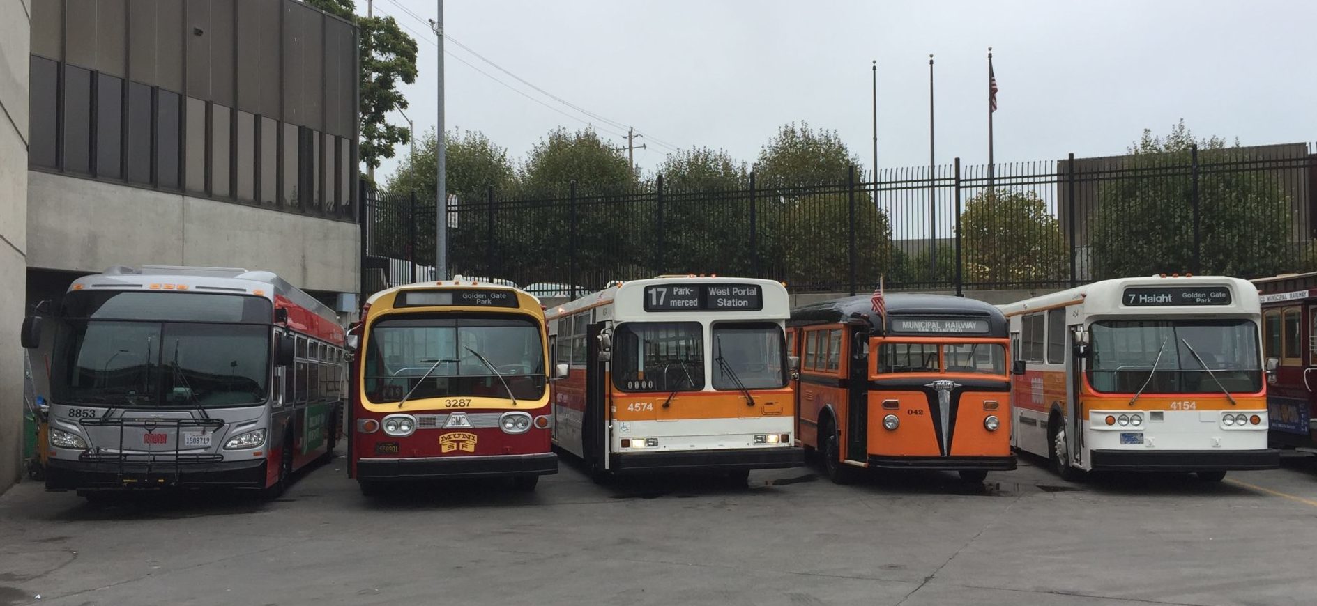 Left to right, Muni buses built in 2017, 1969, 1985, 1938, 1975 at Woods Division, September 8, 2017
