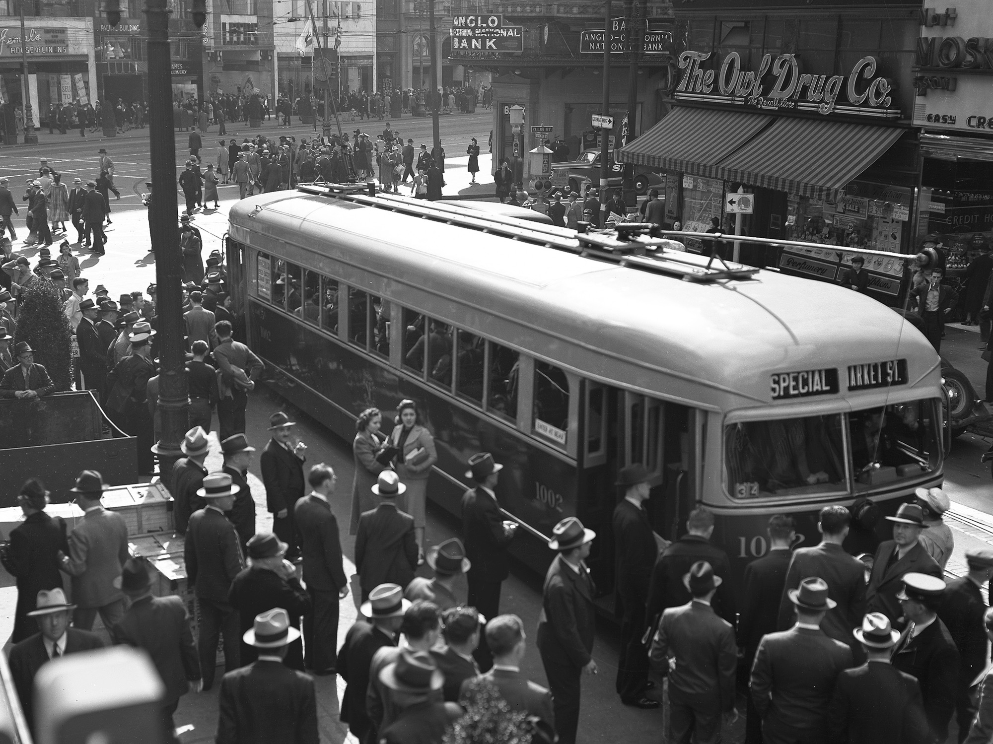 Even America’s first urban transit system that was government-owned — Muni — felt the mix of economic pressures Stromberg describes. After acquiring the assets of the old Market Street Railway in 1944, Muni proceeded to do just what National City Lines did: convert most of its streetcar lines to buses, as quickly as they could. Equipment and track was worn out, increased automobile traffic was slowing streetcar service, and voters wouldn’t approve single-operator streetcars.