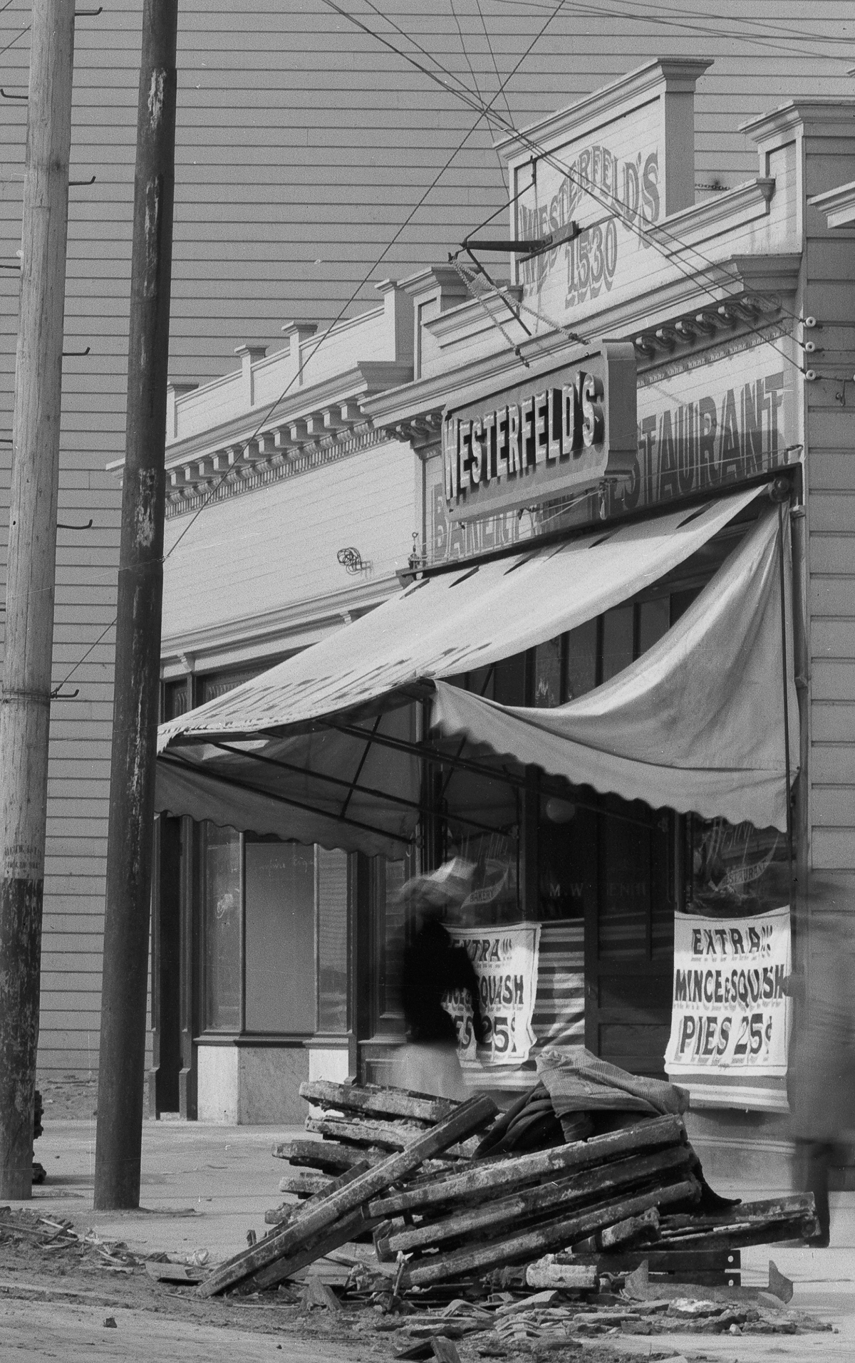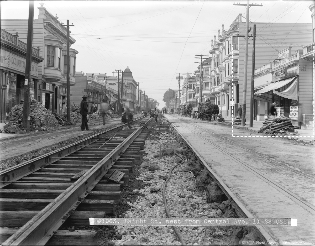 One geek-out observation: here on Haight, United Railroads went to the expense of replacing the tracks of the old standard gauge cable car line, badly damaged in the Earthquake and Fire, with brand new standard gauge streetcar tracks. But just six blocks to the north, on Fulton Street, the company left identical cable car tracks in place and ran streetcars over them for the next 41 years!