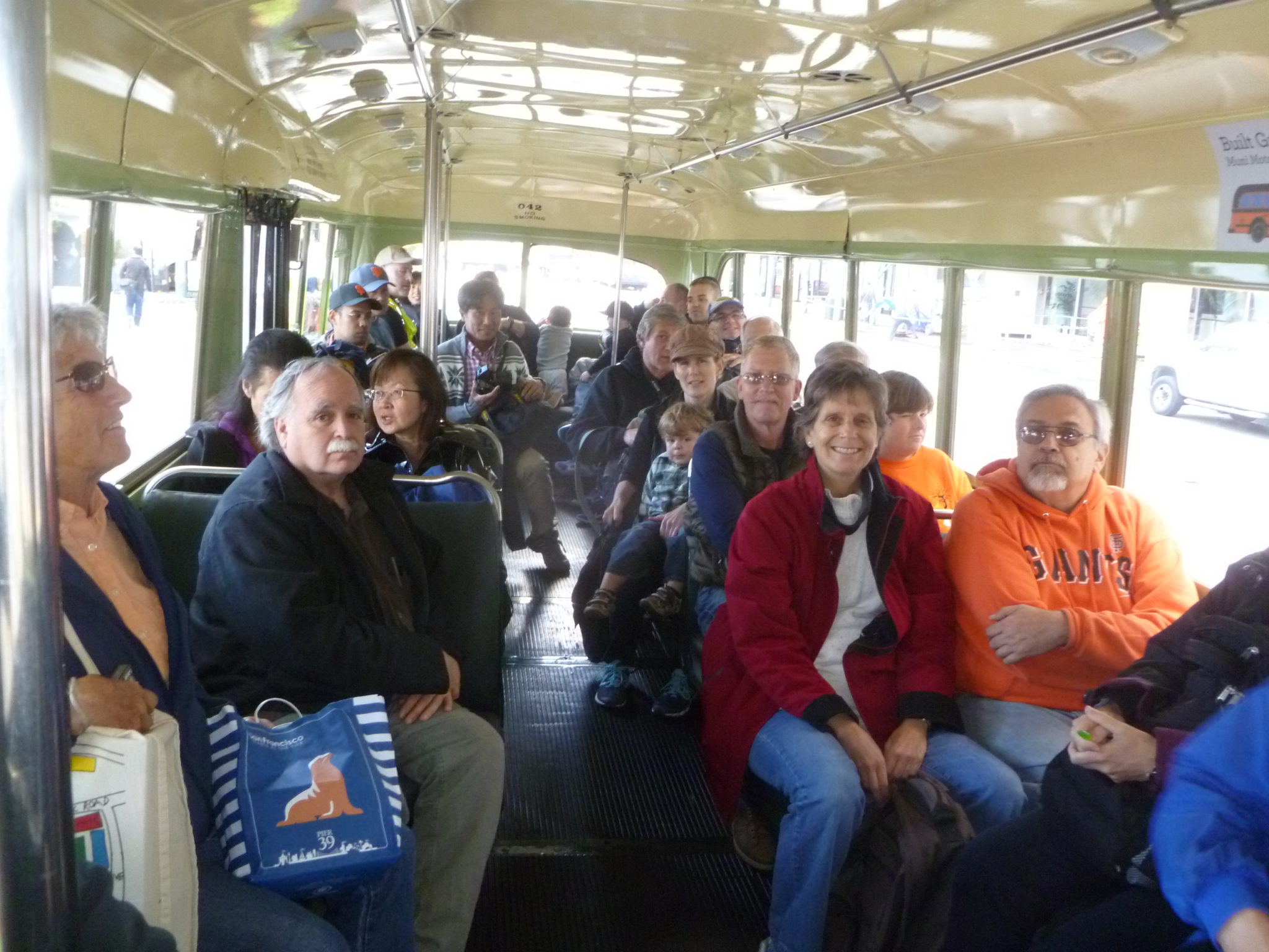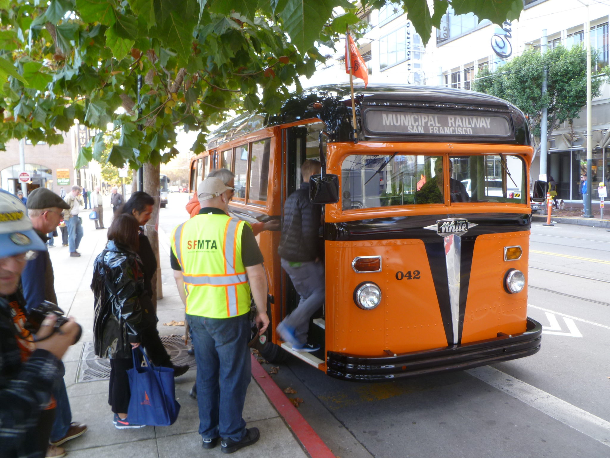 What a start to Muni Heritage Weekend on Saturday (November 1, 2014). 1938 White motor coach No. 042, Muni’s oldest surviving bus, was packed with happy riders all day.