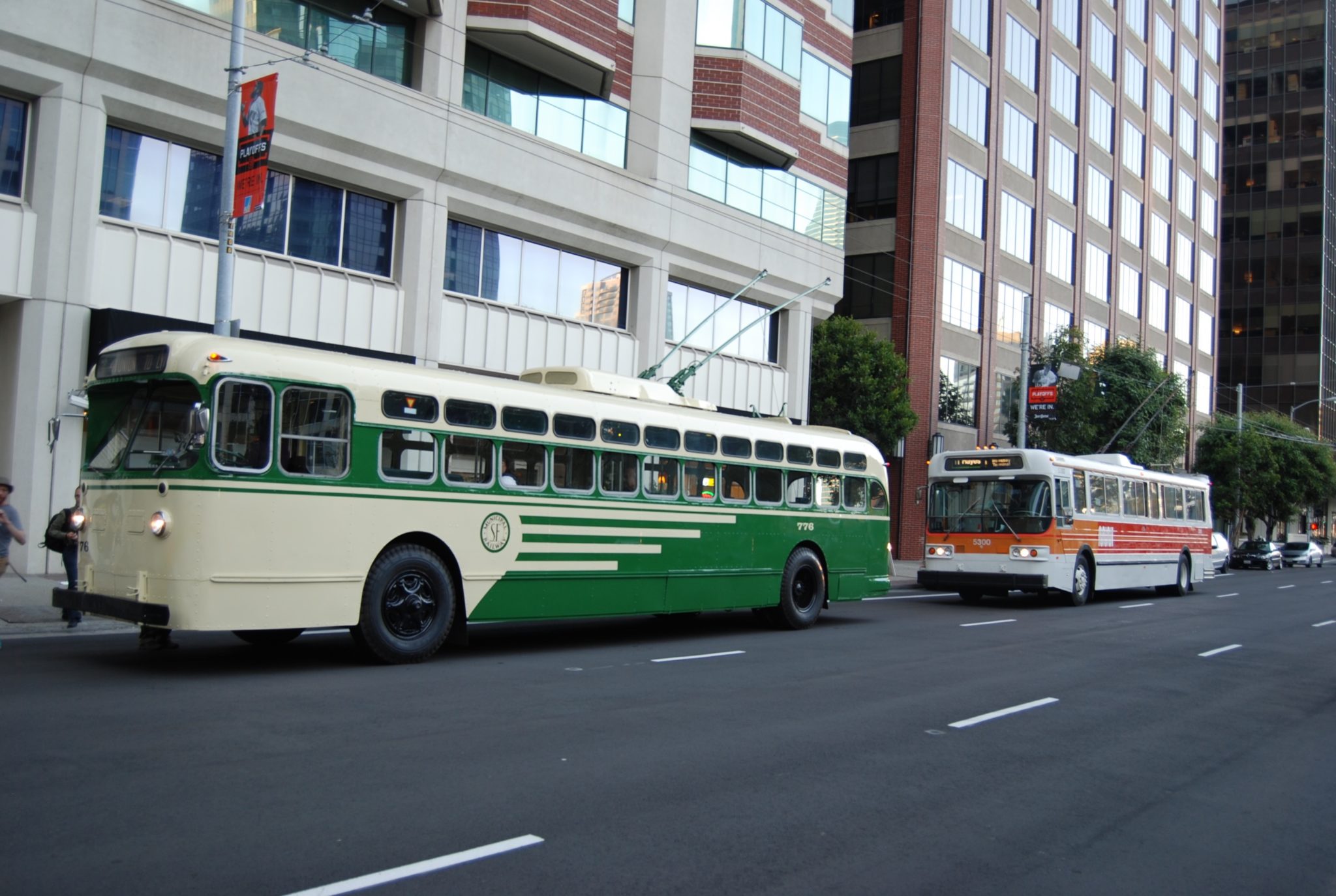 Did we mention buses? Three historic buses will be operating at 15-minute intervals from the museum to Union Square and back via Steuart, Market, Sutter, Mason, Market, Spear, Mission and Steuart. Trolley coaches No. 776 (Marmon-Herrington, 1950) and No. 5300 (Flyer, 1975) will be joined by classic GMC “New Look” No. 3287 (1969). These three buses encompass the past three standard Muni liveries: green and cream “wings” (776), maroon and yellow, borrowed from the California Street Cable Car line (3287) and the famed Landor white, gold, and orange (5300). BONUS: Muni will debut new historic photo displays in the vintage buses.