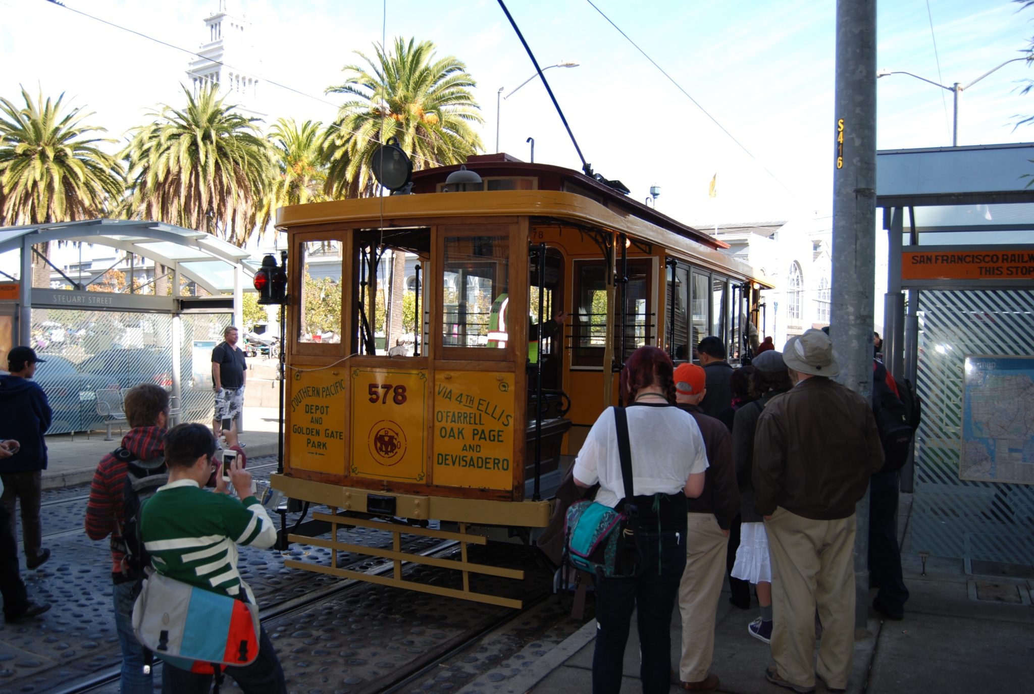 One of the world’s oldest operating streetcars, built 10 years BEFORE the 1906 earthquake, will play a starring role in this year’s Muni Heritage Weekend, September 26-27. Market Street Railway Company single-truck “dinky” No. 578 (above, surrounded by fans at a previous Heritage Weekend), built in 1896, will be running FREE shuttles from our San Francisco Railway Museum at 77 Steuart Street to Pier 39 and back along the scenic Embarcadero.