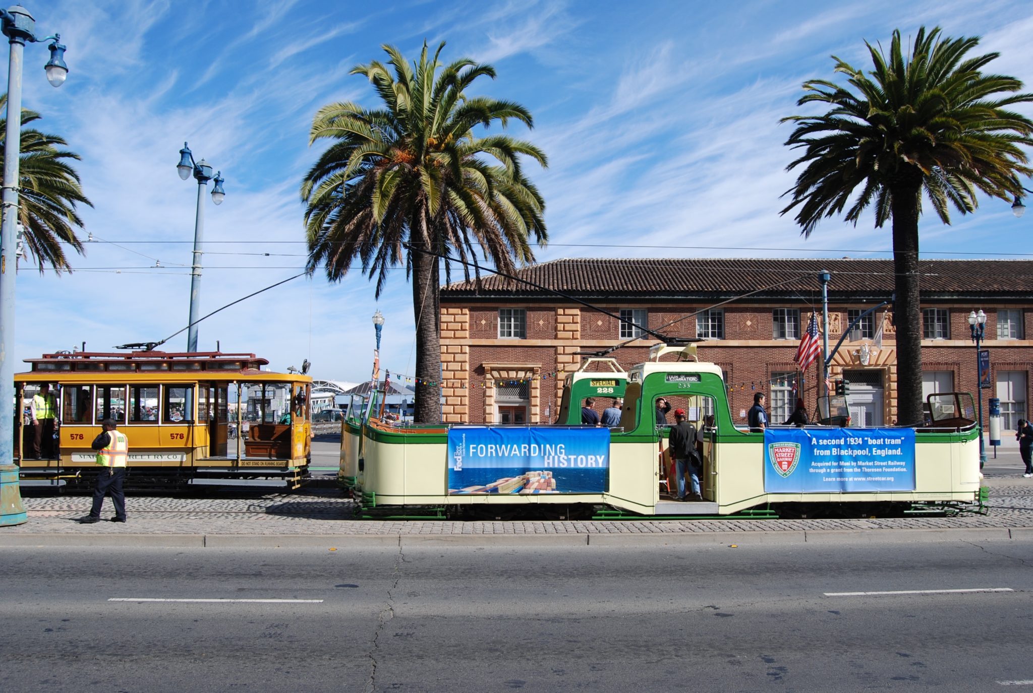 But that’s just the start. The newest member of the vintage fleet, Muni’s latest addition to the heritage fleet, Blackpool, England boat tram No. 233, built in 1934, will join the dinky on the FREE museum-Pier 39 shuttle. Thanks to a generous donation by the Thoresen Foundation and shipping by FedEx Trade Networks, Market Street Railway was able to acquire No. 233 and donate it to Muni to join its near-twin, No. 228, a popular member of Muni’s heritage fleet for the last 30 years.