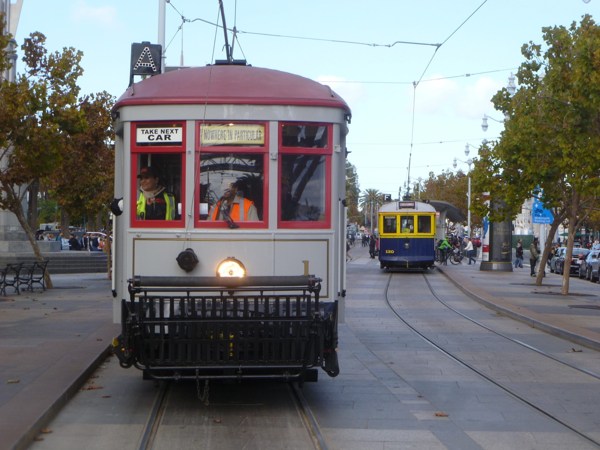 And there’s more. In 1912, America’s first big city publicly owned transit company, the Municipal Railway, debuted on Geary Street, to compete with for-profit competitors. Muni’s very first streetcar, beautifully restored No. 1, will be on the Embarcadero as well. It’s scheduled to be out both days, with two other vintage cars, Muni’s own No. 130 (1914) and Melbourne No. 496 (1928) out one day each. Regular Muni fares apply to these vintage cars, since they’re expected to fill regular runs on the E-Embarcadero (and perhaps F-Market & Wharves) line during the weekend. Note, too, that we expect restored 1948 double-end Muni PCC No. 1006 and 1952 single-end No. 1040, both painted in the classic “wings” livery (shown below on the bus) to be in regular service as well: 1006 on the E, 1040 on the F.