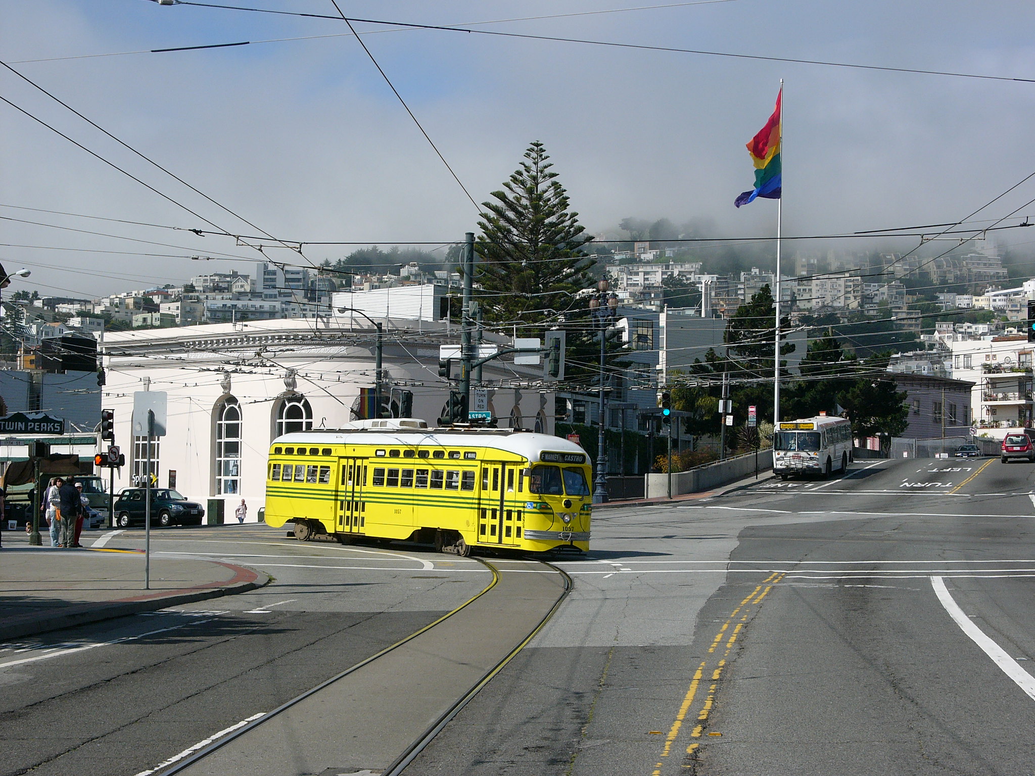 The F-line replaced the 8-line trolley coaches, and was immediately so popular that Muni realized it would need additional cars to operate the planned extension to Fisherman’s Wharf. Muni acquired ten 1928-vintage trams from Milan, Italy, and opened The Embarcadero extension on March 4, 2000, providing direct service from the Castro to Fisherman’s Wharf for the first time. The F-line has proven to be a big help to the small businesses of the Castro and all along its route.