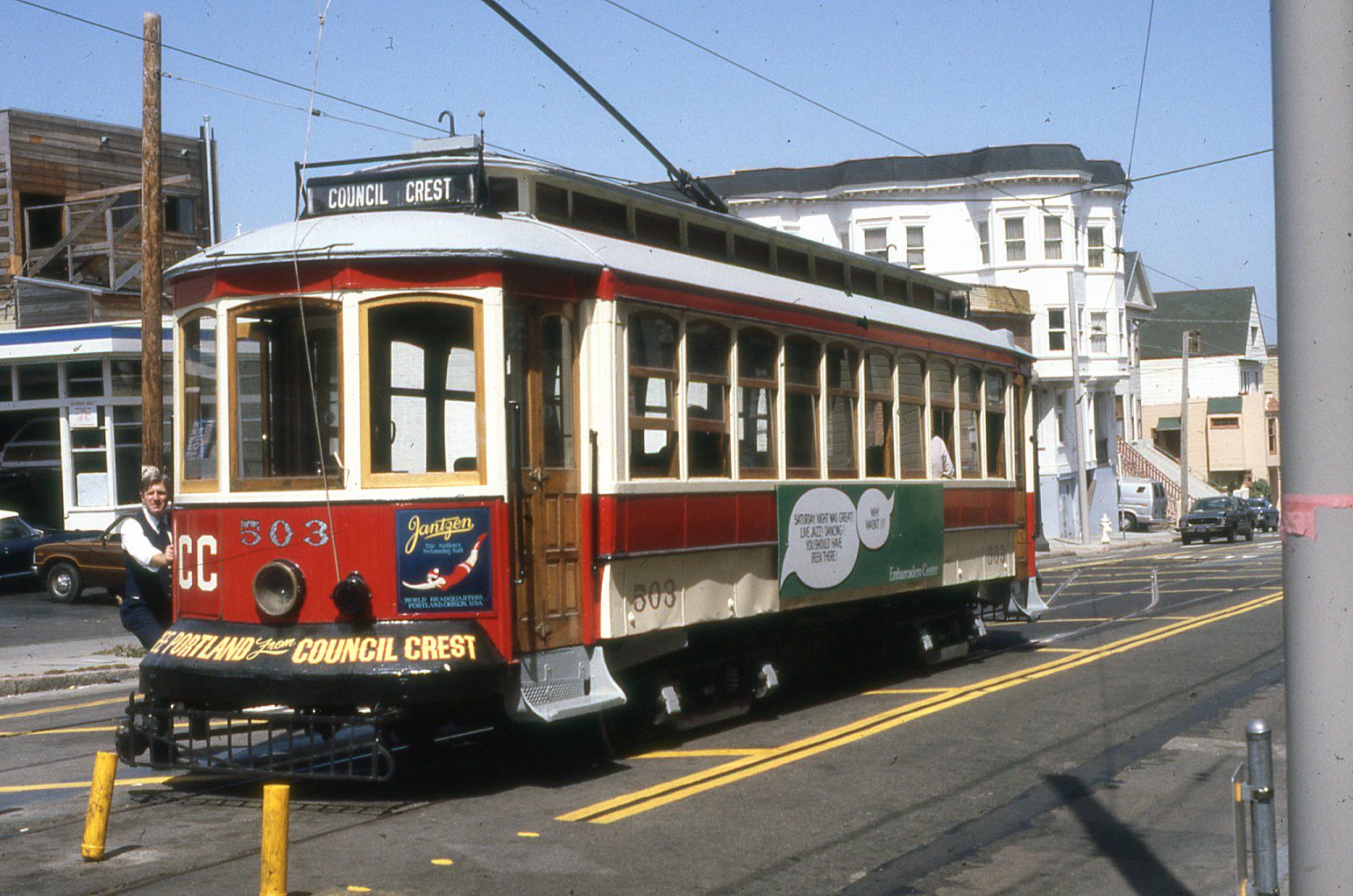 It looked like surface streetcar service to Castro was history when the last ‘green torpedoes’ pulled into the barn in September 1982. But an unusual coalition of downtown business, Upper Market merchants, and Castro residents, organized by members of our nonprofit Market Street Railway, put together something called the Historic Trolley Festival, to operate restored Muni antiques and vintage streetcars from around the world on the Market Street tracks to provide a ‘substitute attraction’ for the cable cars, then being rebuilt. That’s Mayor Dianne Feinstein, opening the first festival on May 27, 1983 aboard Muni’s very first streetcar from 1912, Car 1, at 17th and Castro. It was supposed to be a one-year thing, but its popularity among Upper Market residents, many of whom preferred the old cars to the crowded Metro or the 8-line bus, called for its return. It ran five summers in all, with a mix of streetcars from around the US and the world, including the 1905 Council Crest streetcar from Portland, Oregon, below.