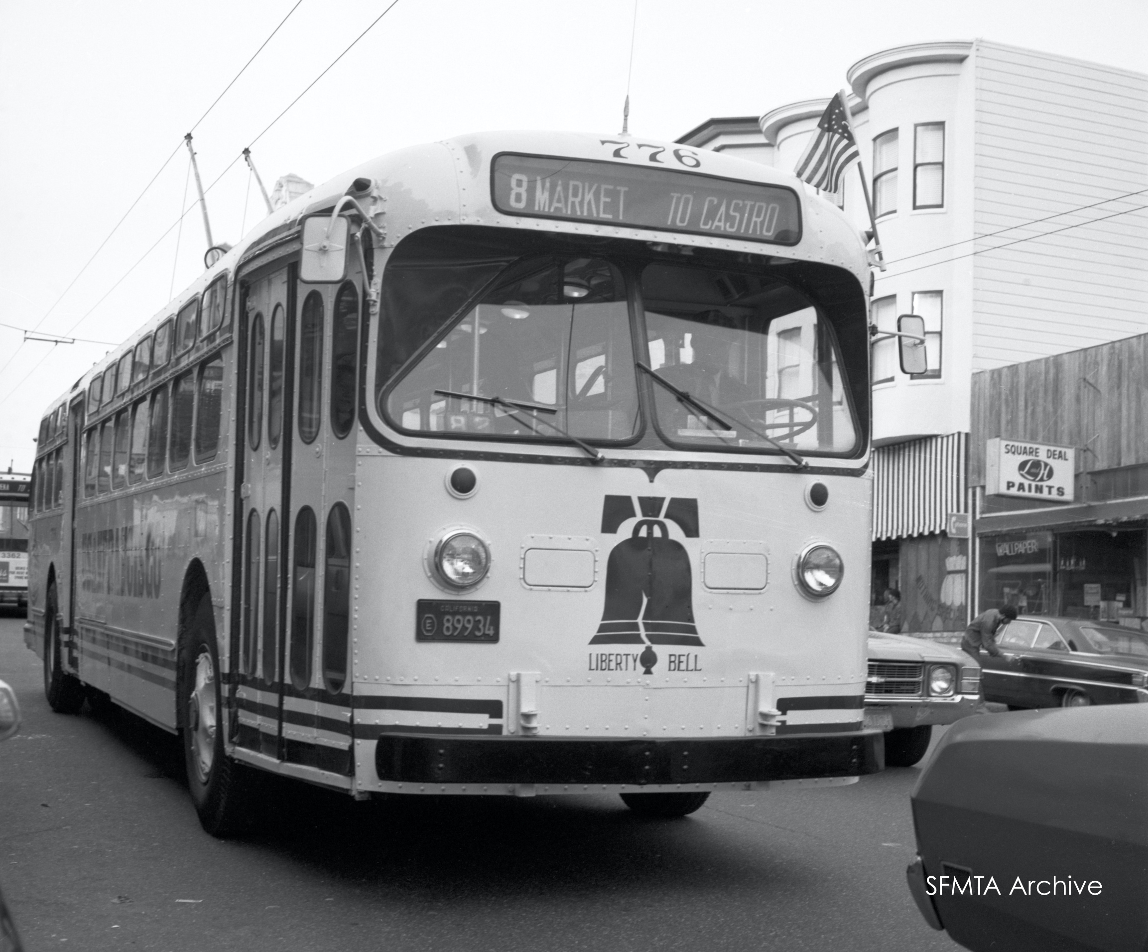 After 43 years of running by the Castro Theater, the 8-line lost its streetcars in 1949, replaced by trolley coaches. The outer streetcar tracks on Market had already been removed, and Muni’s K, L, and M lines took over the 8’s familiar spot in the center of Market. The tracks on Castro were removed too. (In the 1937 shot above, the 8 car switches tracks at its terminal, in front of what’s now Cliff’s Variety. In the 1976 shot directly below, trolley coach 776 is in the exact same spot, with Cliff’s on the far right. That 1950 bus, painted at the time for the national bicentennial, was preserved by Market Street Railway and Muni now runs it on special occasions. The shot below that dates to 1973 and shows how the block of Castro between Market and 18th looked from about 1950 until the street was redone around 2017.)