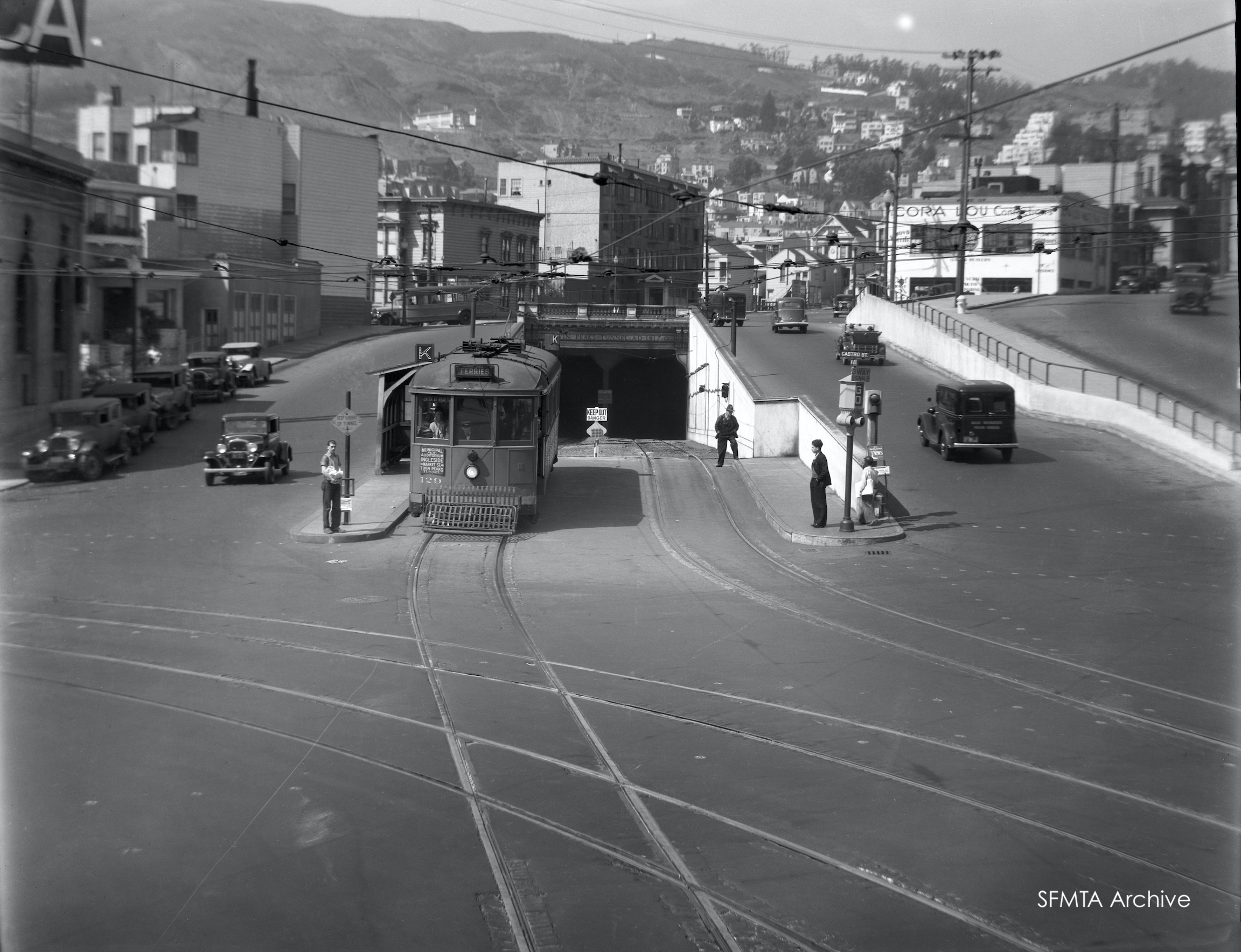 Where to start the tunnel? O’Shaughnessy felt there was only one logical spot: what was then the end of Market Street, at Castro. The Twin Peaks Tunnel opened in 1918, its east portal recessed into a little rise (adjoining what is now Harvey Milk Plaza) so that one day it could be connected to a subway under Market. The private United Railroads wouldn’t share its tracks on Market, so Muni built its own alongside, making four streetcar tracks running all the way up Market. (The 8-line tracks can be seen turning onto Castro in the 1935 photo above; more detail of the tunnel portal below.)