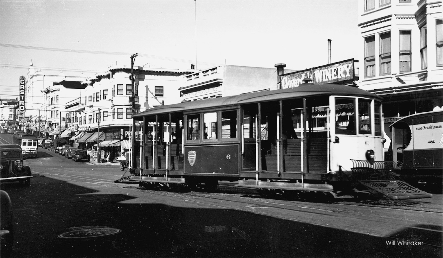 But what a ride it was. The photo above shows Castro Cable Car 6 pulling into its terminal south of 18th Street around 1940, with the Ferry-bound 8-line streetcar across the street, along with the Castro Theater.