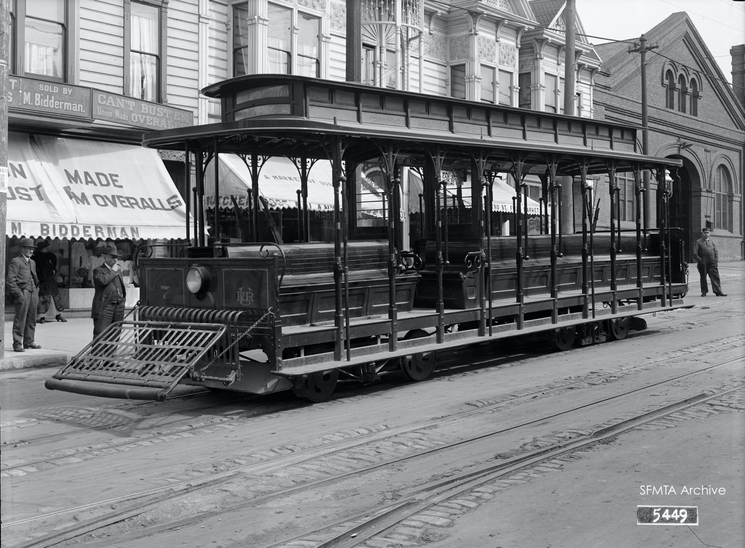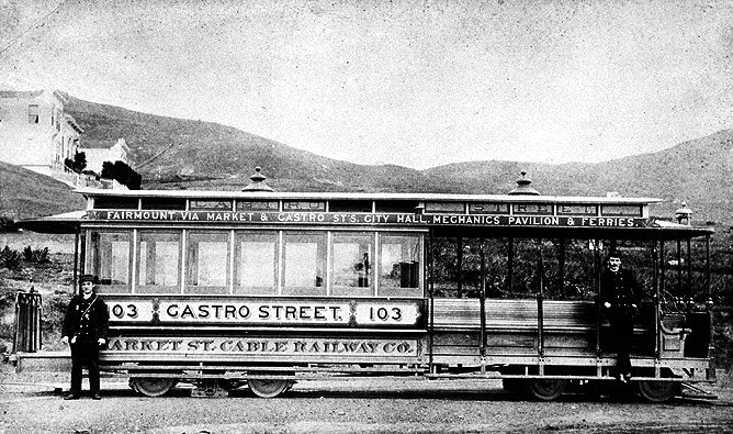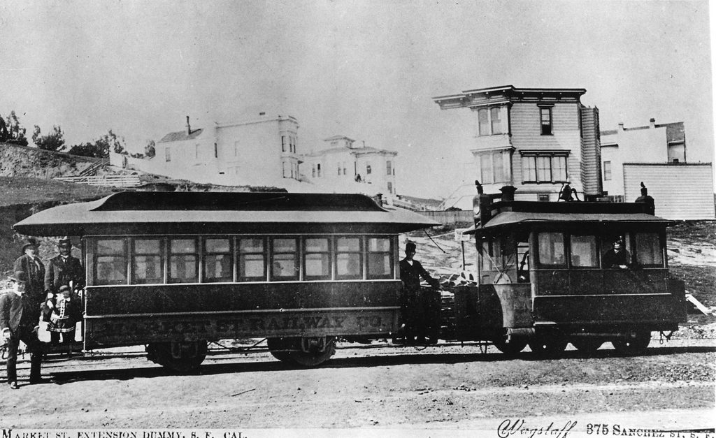 That’s one, right there, on Market at Castro in the 1880s, looking north from where the Chevron station is now. The little box on the right, called the dummy, holds a steam engine and the operator. The trailer holds the passengers. They had to dynamite the hill next to where the Mint stands now, at Duboce Avenue, to cut Market through from downtown. The Market Street Cable Railway Co. ran this steam dummy for several years to connect with cable car service to the Ferry Building at Valencia Street. (A similar steam dummy ran on Market Street downtown for a few years starting in 1860 but the noise drove people nuts on the crowded street.