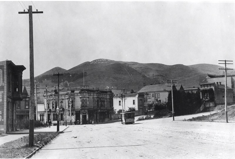 No crowds in Eureka Valley (as The Castro was then called) back when the Market Street Cable Railway Company, owned by Southern Pacific interests, replaced the steam dummy in 1887 with a direct cable car line from the Ferry to Castro on Market, then over the hill on Castro to 26th Street in Noe Valley. The shot above, from the 1890s, looks along Market west of Noe toward Twin Peaks. The ornate building just left of the cable car is the site of the later Bank of America building (now occupied by Soulcycle). The Castro cable line completed the Market Street cable car network, with most of those routes surviving even today as large portions of Muni’s 5, 7, and 21 trolley bus lines, and the F-Market streetcar.