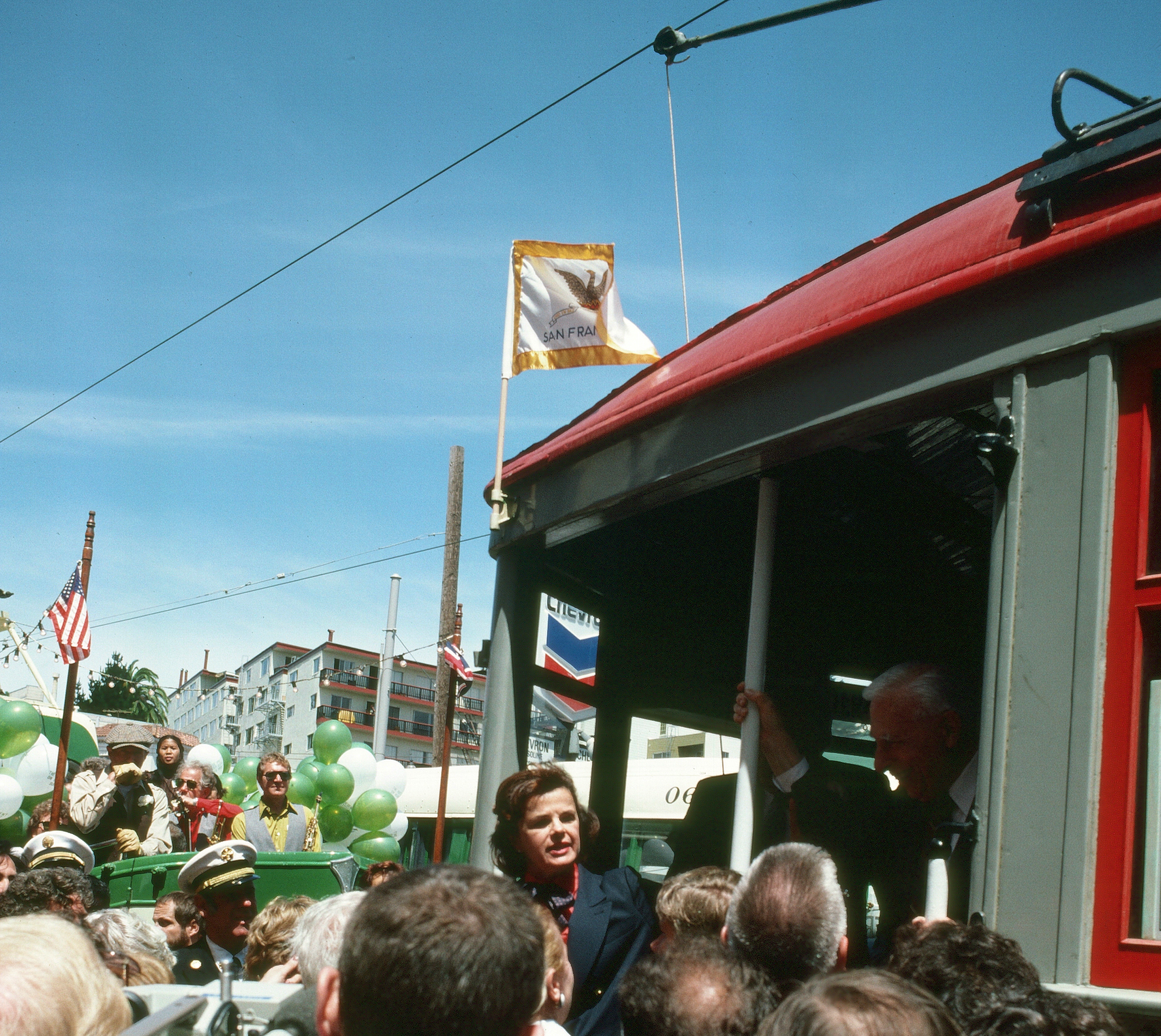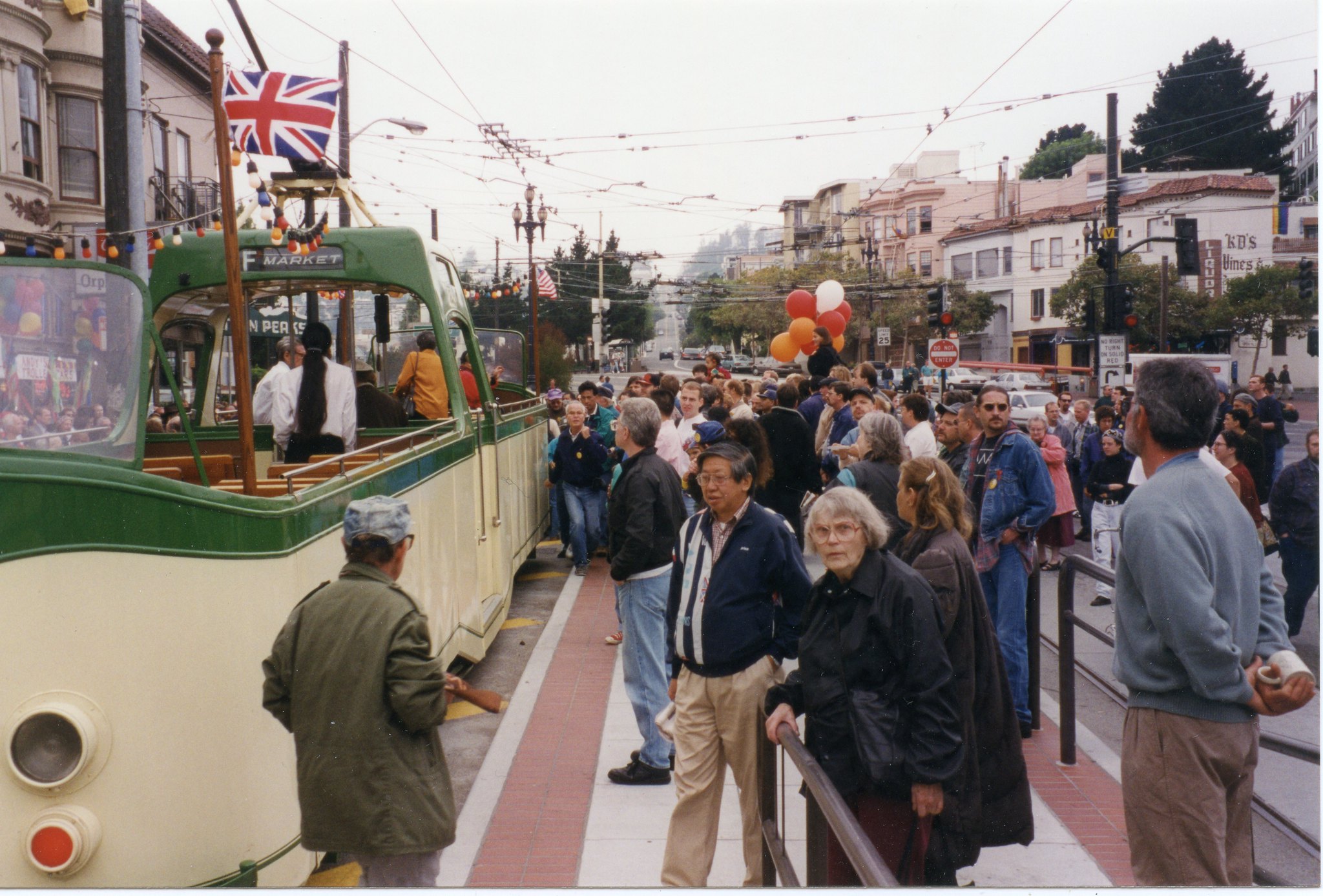 The great success of the Trolley Festivals led to the construction of the F-line, with Castro providing the western anchor of the operation. The opening event on September 1, 1995, featured the popular open-top Blackpool, England boat tram, but basic service has been provided by popular PCC streetcars, painted to honor the various cities that once operated this historic vehicle type.