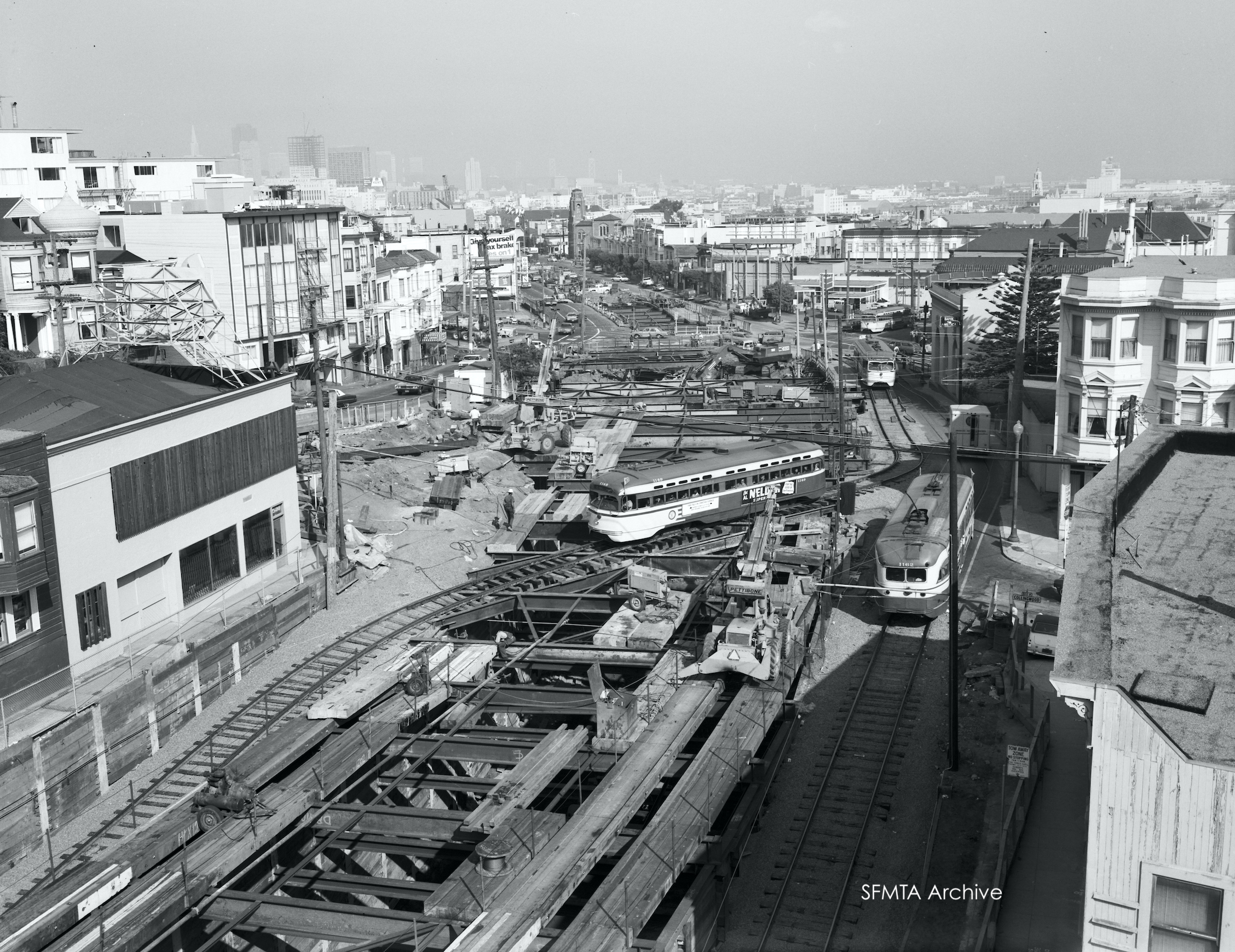 During the protracted construction, though, Muni had to keep running the PCCs, because there weren’t enough buses to substitute. The streetcars were moved off Market, so the subway between Duboce and Castro could be built easily. The “temporary” streetcar detour included new tracks on 17th Street (still there!) between Church and Castro.