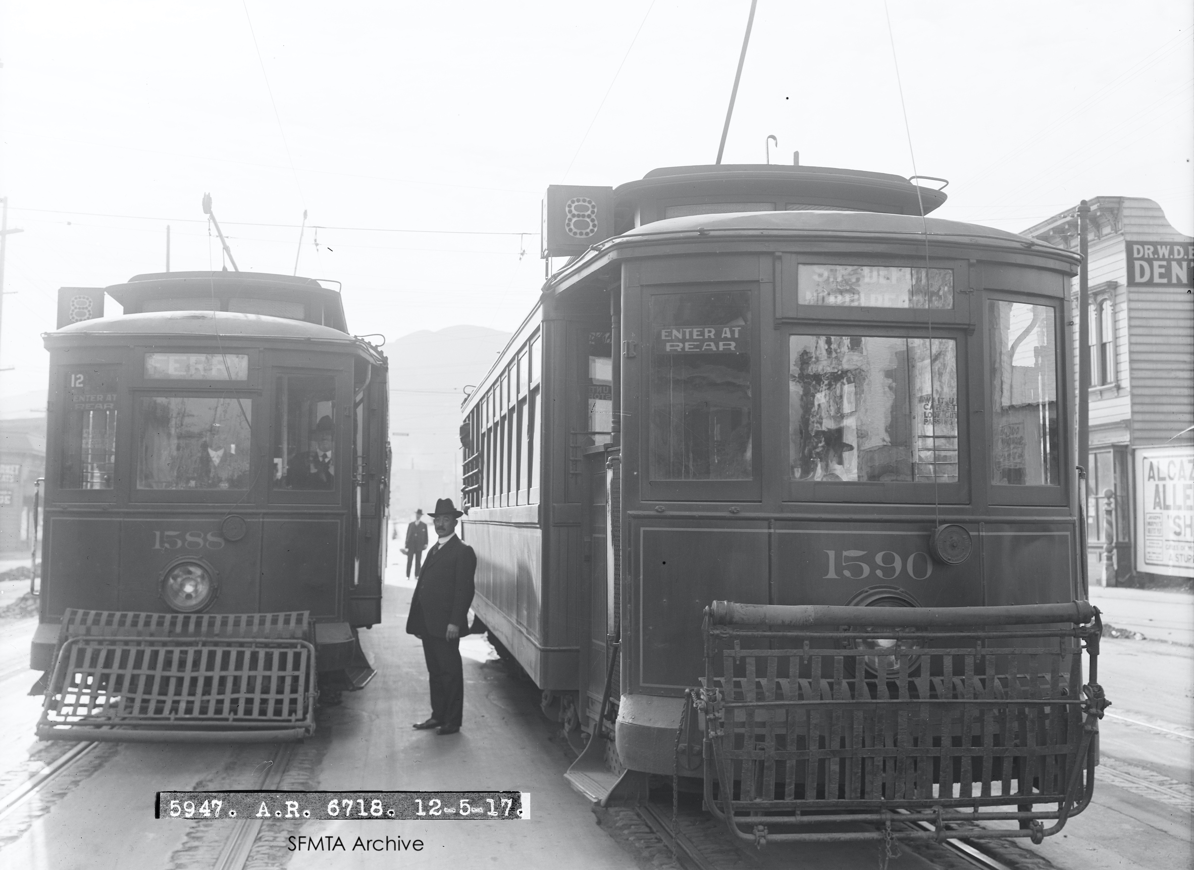 The Castro cable cars were rebuilt by Market Street Railway in 1927 into the prosaic design you see above from a rebuild 20 years earlier by United Railroads that was fancier, and even included the stunning open “breezer” below, pictured in 1916, which operated for a number of years on nice days. (Imagine climbing the hill on that!)
