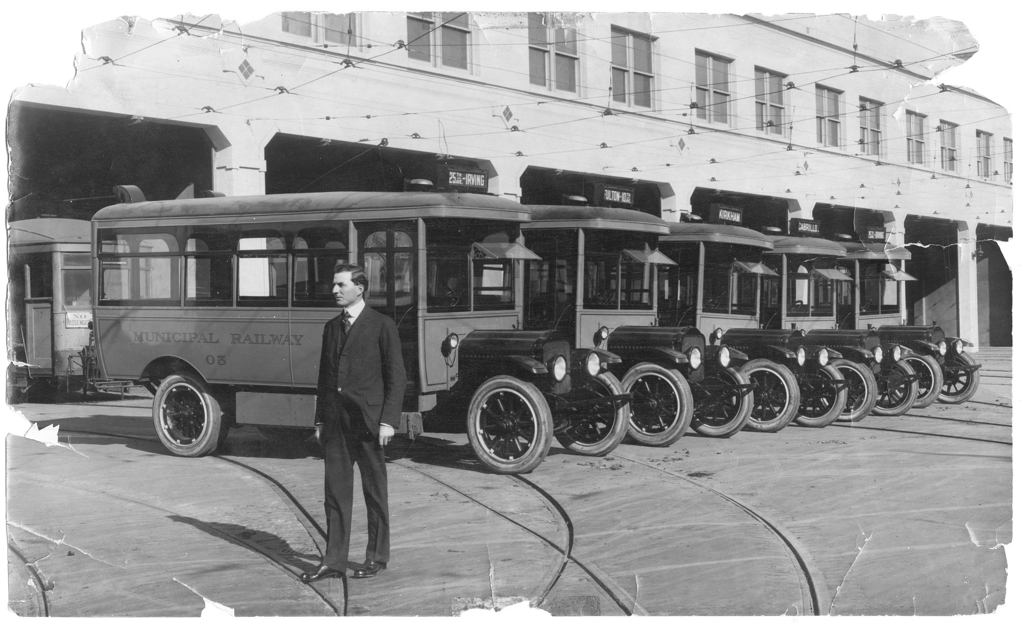 Muni Superintendent Fred Boeken poses with Muni’s first five motor coaches (White Motor Co.) outside Geary Division, 1918. Photo from SFMTA Archives.