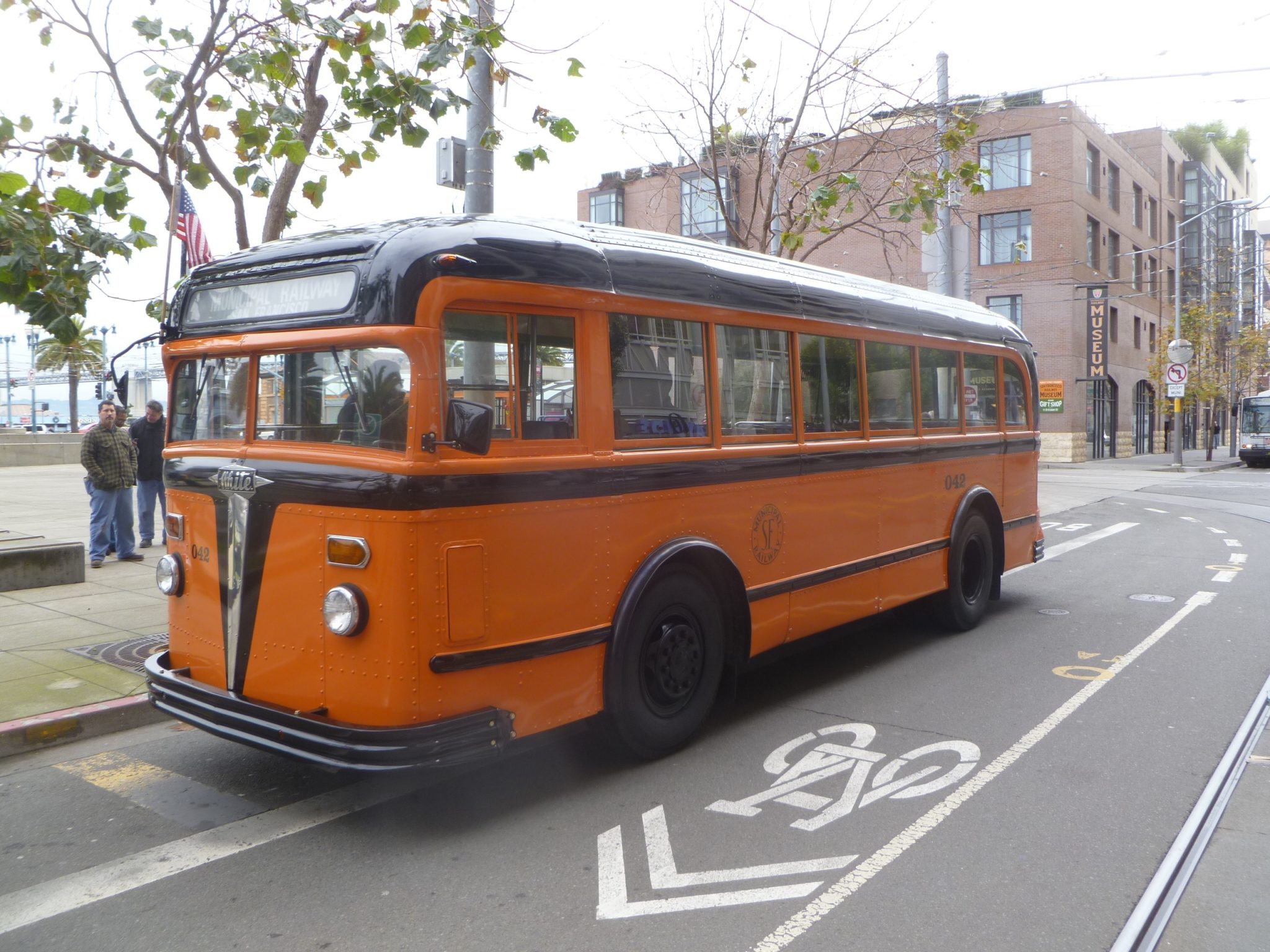 Muni’s oldest surviving bus, built in 1938 by White Motor Company and numbered 042, restored to its original orange and black paint scheme, will run from the museum to Levi’s Plaza and back, as will 1969 GMC “Fishbowl” 3287, painted in the new livery of that day, which was modeled on the maroon worn by the California Street Cable Cars.