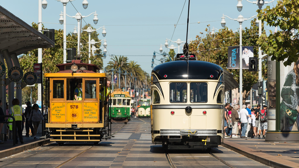 The dates for the 2018 Muni Heritage Weekend have been finalized: Saturday-Sunday, September 8-9. The three vintage streetcars in this great shot by Wayne Worden from a past Heritage Weekend should be running again: 1896 Market Street Railway single-truck “dinky” 578, 1929 Melbourne 496, and 1934 Blackpool, England boat tram 228, along with Muni’s venerable Car 1 and others, all subject to operational readiness at the time, of course.
