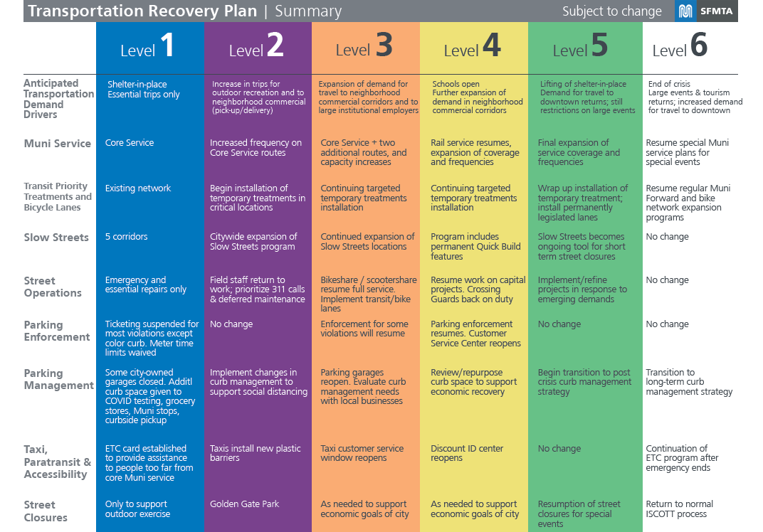 SFMTA has just released a “Transportation Recovery Plan” with six levels, tied to the resumption of business and personal travel in the city.