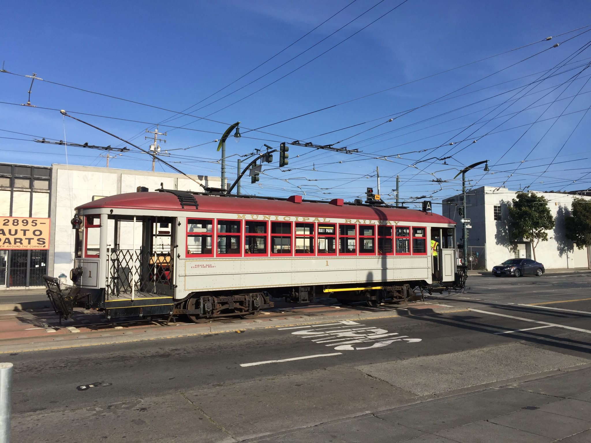 In 1914, the San Francisco Seals moved to a brand new ball park, Ewing Field, on Masonic Avenue. Muni built a spur track from Geary Street along Masonic to serve the new ball park, and assigned some runs of the A-line to Ewing on game days. No run assignments survive from those days, but Car 1 was based at Geary Division, just three blocks away, in 1914, so it’s at least a possibility it served Ewing Field for that year’s opening game (which the Seals lost to Oakland, 3-0). The photo below shows a Muni streetcar of Car 1’s type (possibly Car 1 itself) on the A-line at the Ferry Building with a “Ball Park” designation on the dash. The “1915” on the Ferry Building tower signifies the upcoming Panama-Pacific International Exposition, but the photo was taken during the 1914 baseball season, and the “ball park” reference is to Ewing Field.