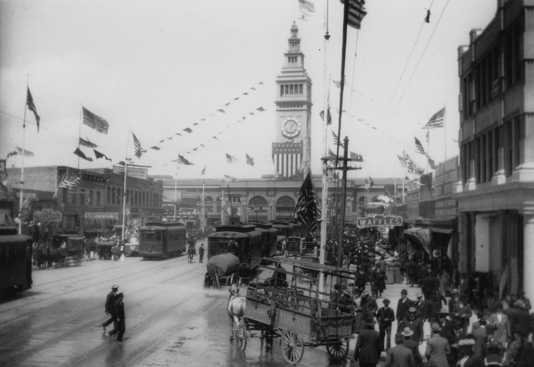 Lots of streetcars but even more American flags on and around the Ferry Building on a bright afternoon in October 1909, 1:29 p.m. We don’t know the exact date or who took the photo; if someone knows, fill us in with a comment.
