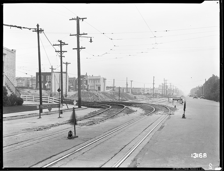 Other sources confirm that Sunset Boulevard was built in 1931, but we hadn’t known it was a Depression-era job creation project. Our search didn’t determine whether Market Street Railway, which operated the 7-line, was asked to pay for the detour itself, or whether the city underwrote it. Afterward, the tracks ran across the new bridge constructed to carry Lincoln Way over Sunset, until the 7-line closed in 1948.