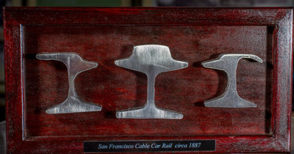 First used in the 1880s, this rail saw service for nearly 75 years before being removed in 1954 when San Francisco’s cable car system was downsized to its present configuration.The three different profiles are from straight, shared and curved tracks.